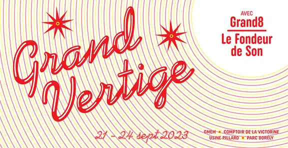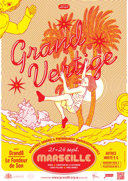 Grand Vertige 2023 revisite des espaces explorés les deux précédentes années. Une soirée d’ouverture au Comptoir de la Victorine, lieu de vie cher au 3e arrondissement de Marseille. Un concert en double ensemble dans le dôme du GMEM pour un moment d’immersion sonore totale, une performance multidisciplinaire à l’Usine Pillard, et des performances en plein air au parc Borély. Plus de vingt artistes, musiciens et musiciennes, danseur.euses, et une plasticienne, sont réunis avec comme seule direction l’improvisation.